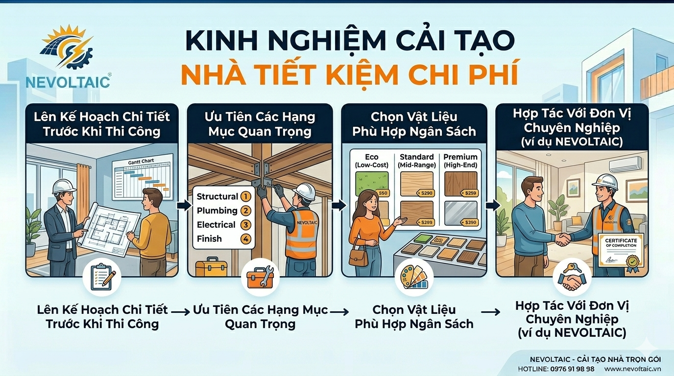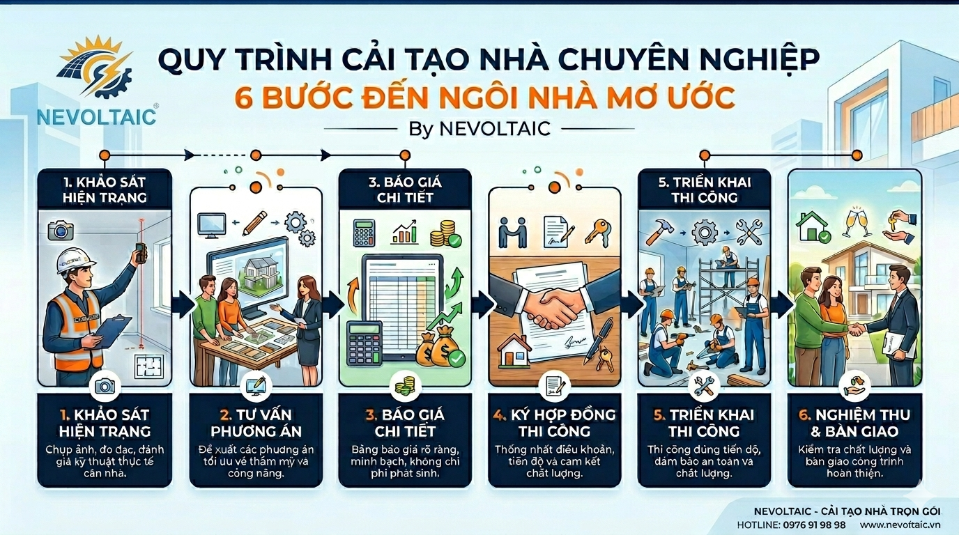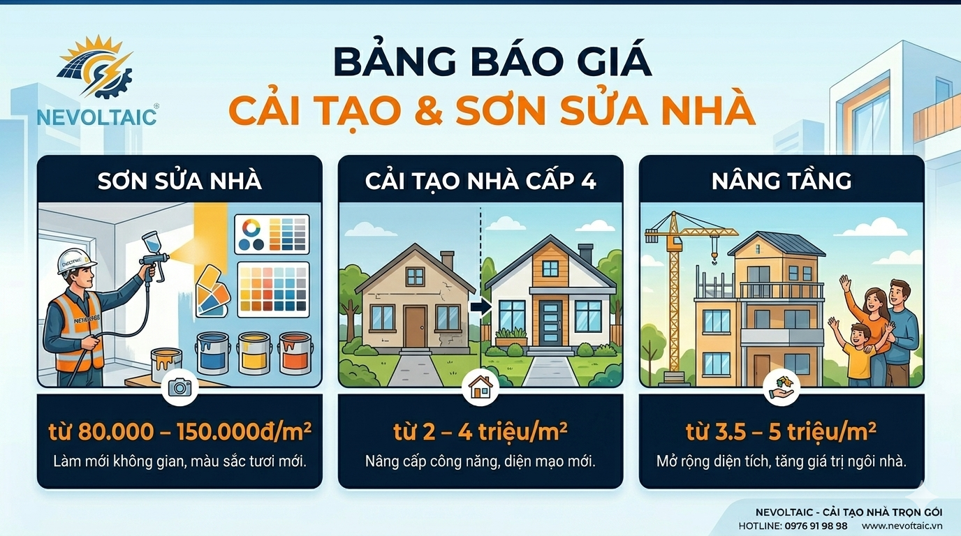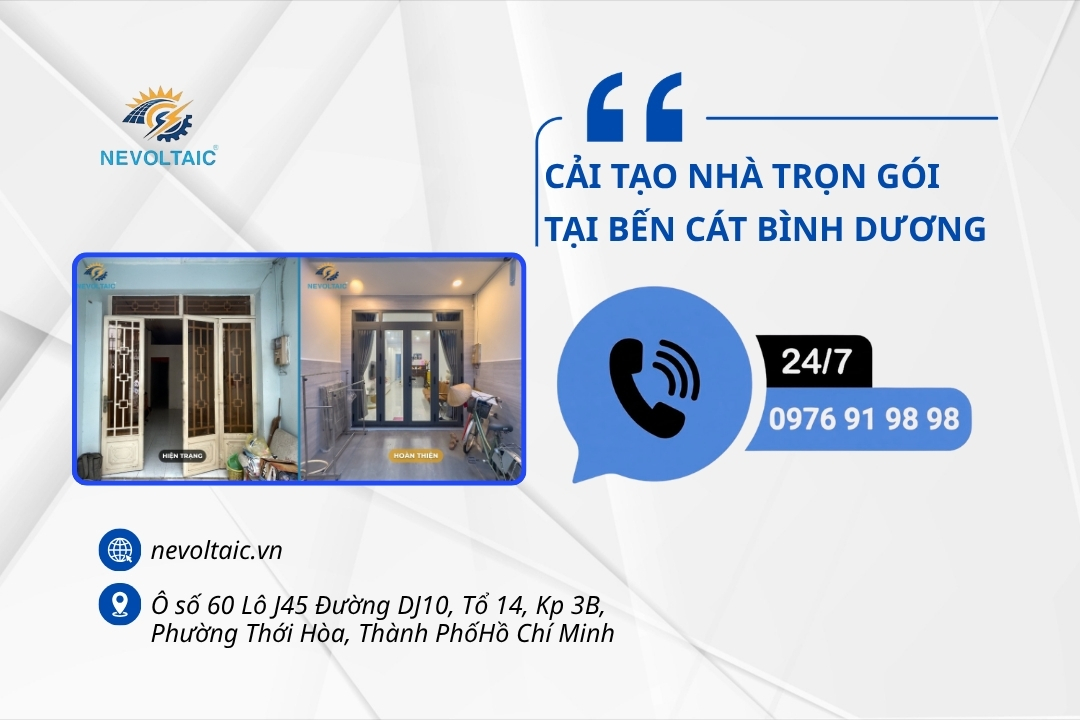 NEVOLTAIC là đơn vị chuyên thi công xây dựng và sửa chữa nhà ở giá rẻ – uy tín – chất lượng hàng đầu tại Việt Nam. Với nhiều năm kinh nghiệm hoạt động trong ngành, chúng tôi tự hào là người bạn đồng hành đáng tin cậy của hàng nghìn khách hàng, cùng nhau kiến tạo nên những công trình vững chãi, thẩm mỹ và mang đậm dấu ấn riêng.Tầm nhìn & Sứ mệnh của nevoltaicChúng tôi tin rằng mỗi công trình nhà ở là một tác phẩm nghệ thuật. Chính vì vậy, NEVOLTAIC không ngừng đổi mới, sáng tạo trong thiết kế – thi công để mang đến những không gian sống tối ưu cả về công năng lẫn thẩm mỹ. Chúng tôi đặt chữ Tâm và chữ Tín lên hàng đầu trong mọi hoạt động. Sự hài lòng và niềm tin của khách hàng chính là nền tảng bền vững để chúng tôi phát triển và không ngừng vươn xa. Bên cạnh việc đầu tư mạnh mẽ vào năng lực nhân sự, máy móc thiết bị hiện đại và công tác an toàn lao động, nevoltaic còn chú trọng xây dựng đội ngũ kỹ sư, kỹ thuật viên và công nhân lành nghề, được đào tạo chuyên sâu, có khả năng tư duy linh hoạt và quản lý chặt chẽ từng công đoạn thi công. Chúng tôi đã và đang triển khai hàng loạt công trình nhà ở tại TP.HCM và các tỉnh lân cận, mang đến cho khách hàng những sản phẩm hoàn thiện nhất – kết tinh từ kinh nghiệm, sáng tạo, trí tuệ và quy trình quản lý khép kín. Phương châm hoạt động: “Lấy chất lượng làm uy tín – Lấy sự hài lòng của khách hàng làm kim chỉ nam.”⸻Dịch vụ xây dựng tại nevoltaicnevoltaic cung cấp đa dạng dịch vụ trong lĩnh vực xây dựng và cải tạo công trình, bao gồm:• Xây nhà trọn gói từ móng đến hoàn thiện• Thiết kế & thi công nội thất – tối ưu không gian sống• Sửa chữa – cải tạo nhà ở dân dụng, nâng cấp nhà cũ• Thi công lắp ráp nhà xưởng, công trình công nghiệp• Cải tạo công trình xuống cấp, đảm bảo an toàn và thẩm mỹ• Lắp đặt hệ thống điện năng lượng mặt trời, hướng tới cuộc sống xanh – tiết kiệm – bền vững⸻Hãy để nevoltaic đồng hành cùng bạn không chỉ chọn một nhà thầu xây dựng, mà là chọn một đối tác tận tâm, sẵn sàng lắng nghe, tư vấn và hiện thực hóa ngôi nhà mơ ước của bạn. Liên hệ với chúng tôi ngay hôm nay để được tư vấn giải pháp phù hợp, tiết kiệm chi phí và đảm bảo hiệu quả lâu dài cho mọi công trình!CÔNG TY TNHH CÔNG NGHỆ KỸ THUẬT ĐIỆN NEVOLTAICđịa chỉ : Ô số 60 Lô J45 Đường DJ10, Tổ 14, Kp 3B, Phường Thới Hòa, Thành phố Hồ Chí Minh, Việt Namhotline : 0989919898 - zalo : 0989919898wb : nevoltaic.vn - mail : nqt280782@gmail.com