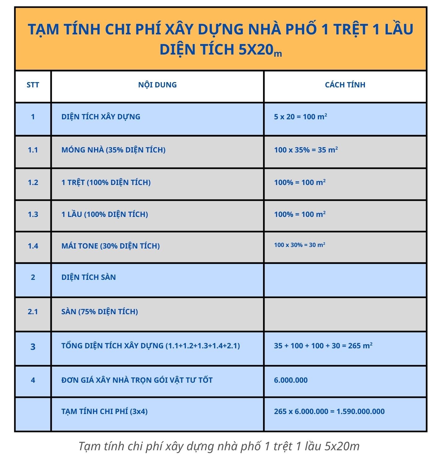 Vậy có phải nếu chúng ta xây dựng 1 căn nhà 1 trệt 1 lầu với diện tích 5×20 thì chi phí sẽ như thế này: